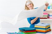 młody biznes kobieta siedzi na kanapie z luksusowe torby na zakupy, rozpakować nowe ubrania