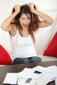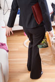 uśmiechający się biznes kobieta z torbą na zakupy siedzi na kanapie w salonie