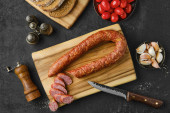 Widok z bliska na wędzoną kiełbasę wołową na drewnianej desce do krojenia na stole kuchennym