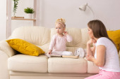 matka i dziecko w salonie oglądać telewizji, matka na telefon w tle na kanapie