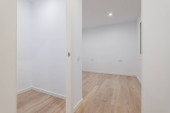 Puste jasne wejście do mieszkania z zamkniętymi drzwiami, korytarzem i szafą.