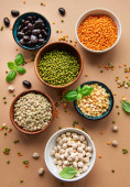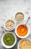 Miski z różnymi rodzajami roślin strączkowych na szarym tle betonowym