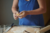 Cięcie ciasta na domowej roboty makaron. Kobieta tnie ciasto nożem do makaronu, na drewnianym stole.