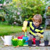 Urocza dziewczynka trzymająca łopatę ogrodową z zielonymi roślinami sadzącymi w dłoniach. Cute dziecko uczyć się ogrodnictwa, sadzenia i uprawy warzyw ziół w ogrodzie domowym. Ekologia, żywność ekologiczna.