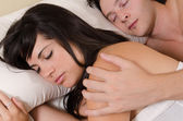 młody człowiek ogląda budzik, Kobieta, spanie w łóżku biały