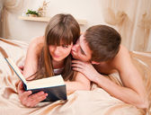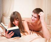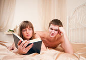 młody mężczyzna i kobieta, leżącej na białej kanapie, Kobieta, czytanie książki
