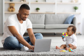 Zdjęcie "Młody ojciec opiekuje się synem podczas pracy na laptopie" może być wykorzystywane do celów osobistych i komercyjnych zgodnie z warunkami zakupionej licencji Royalty-free. Obraz jest dostępny do pobrania w jakości wysokiej rozdzielczości do 5760x3840.
