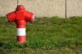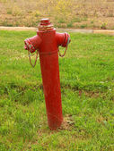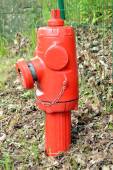 Czerwony typowy amerykański hydrant przeciwpożarowy na wiejskiej ulicy.