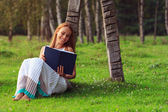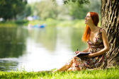 szczęśliwą kobietą romantyczny siedzący nad jeziorem z książki, noszenie białej sukni