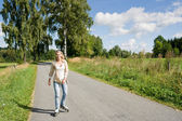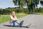 kobieta z staromodny rower w lato łąka na słoneczny dzień