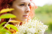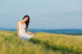 długie Rude włosy kobieta w romantyczny zachód łąka