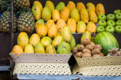 Zbliżenie kolorowe stoisko owocowe z mango Keitt i jicamas