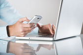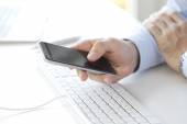 Zespół firmy z smartphone i klawiatury komputera pod ręką