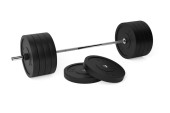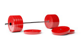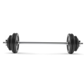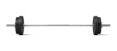 Sztanga z chromowaną rączką i czarnymi płytami widok z przodu na białym tle, sport, fitness, ćwiczenia lub koncepcja podnoszenia ciężarów, ilustracja 3D