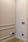 Nowo zainstalowany biały parapet konglomeratu wewnątrz pomieszczenia, na szarej ścianie.