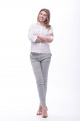 Piękna, czarująca blondynka pozująca w studio na odosobnionym tle. Styl, trendy, koncepcja mody.