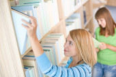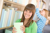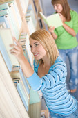 student w bibliotece - dwa szczęśliwą kobietą wybierz książkę z półki