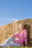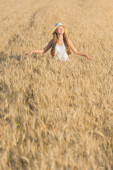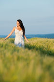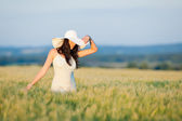 Szczęśliwa młoda kobieta w polu kukurydzy podziwiać zachód słońca na słoneczny dzień