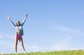 Zdjęcie "Szczęśliwa kobieta skok w polu kukurydzy w okresie letnim" może być wykorzystywane do celów osobistych i komercyjnych zgodnie z warunkami zakupionej licencji Royalty-free. Obraz jest dostępny do pobrania w jakości wysokiej rozdzielczości do 5760x3840.