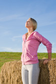 Szczęśliwa kobieta skok w polu kukurydzy w okresie letnim