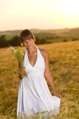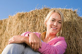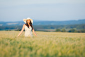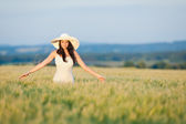 Szczęśliwa kobieta z Słomkowy kapelusz w polu kukurydzy