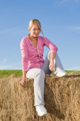młoda kobieta w zachód kukurydza dziedzinie gospodarstwa stokrotka