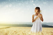 romantyczny brunetka kobieta w sukni nosić białe pole zachód zboże, trzymając bukiet kwiatów