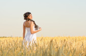 romantyczny brunetka kobieta w sukni nosić białe pole zachód zboże, trzymając bukiet kwiatów