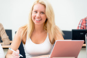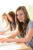 studium szczęśliwy uśmiechający się ucznia w klasie na Uniwersytecie