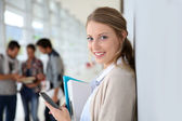 szczęśliwy młody blond kobieta trzymania książek stałego