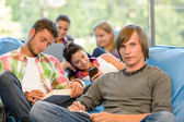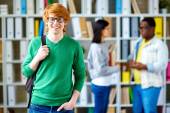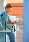 mężczyzna nastolatek posiadania stałego książki w nowoczesne szkło budowlane