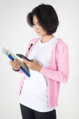 Portret pięknej kobiety w czerwonej sukience, przerażony wyraz twarzy Patrzyłem na coś na ręce. Na białym tle
