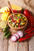 Pikantny meksykański sos salsy z mango, chili, pomidorami i bazylią w drewnianej misce i drewnianej desce do krojenia widok z góry, zdjęcie pionowe