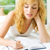 młoda kobieta, pisanie notatek i leżąc na łóżku, płytkie dof
