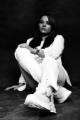 Zdjęcie "Piękna, pozytywna brunetka pozująca w studio na tle płótna. Relaks, elegancja, koncepcja mody." może być wykorzystywane do celów osobistych i komercyjnych zgodnie z warunkami zakupionej licencji Royalty-free. Obraz jest dostępny do pobrania w jakości wysokiej rozdzielczości do 5760x3840.