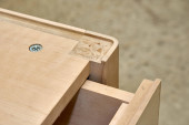 Część nowego dużego drewnianego stołu jadalnego z otworami na wstawki do złączy blatowych w lekkim warsztacie stolarni ekstremalnie bliski widok