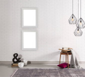Koncepcja lampy dekoracyjnej w pomieszczeniu, ścianie i wazonie roślin, ramka zielony stolik kawowy.