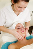 Pielęgnacja twarzy - kobieta w salonie stosuje się proszek