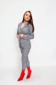 Atrakcyjna Europejka z czarnymi włosami i okularami pozująca w studio na odosobnionym tle. Styl, trendy, koncepcja mody.