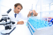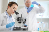 Eksperyment z wirusem grypy - naukowiec w laboratorium z mikroskopem, noszenie okularów ochronnych