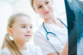kobieta lekarz pisze receptę dla dziecka w klinice