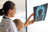 młoda kobieta lekarz Pokaż x-ray do dziecka na Wydział medyczny