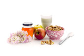 zdrowe płatki zbożowe z mlekiem i owocami na białym tle