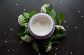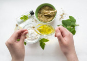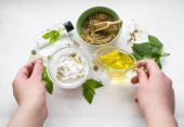 Przygotowanie alternatywnego leku, ekstrakt ziołowy: białe tło, ręce trzymać słoik oleju na misce z białą esencją, i mieszając. Miska z ziemią suche zioła lecznicze, zielone liście i tabletki.
