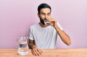 Hiszpan z brodą pijący szklankę świeżej wody mineralnej na stole.
