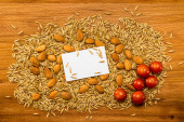 Pomidory wiśniowe, seler i migdały z kukurydzą na drewnianym stole.