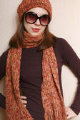 portret hiszpanin moda model nosi czapkę, siedząc na antyczny fotel