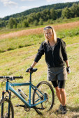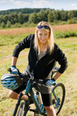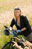 młoda kobieta z rowerów górskich w przyrodzie wiosną na słoneczny dzień