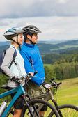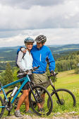 Młoda para jazda rower górski w natura wiosna łąka na słoneczny dzień