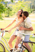 romantyczna para młoda z stary rower w przyrodzie wiosną na słoneczny dzień